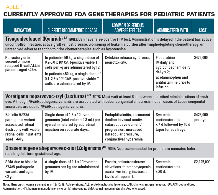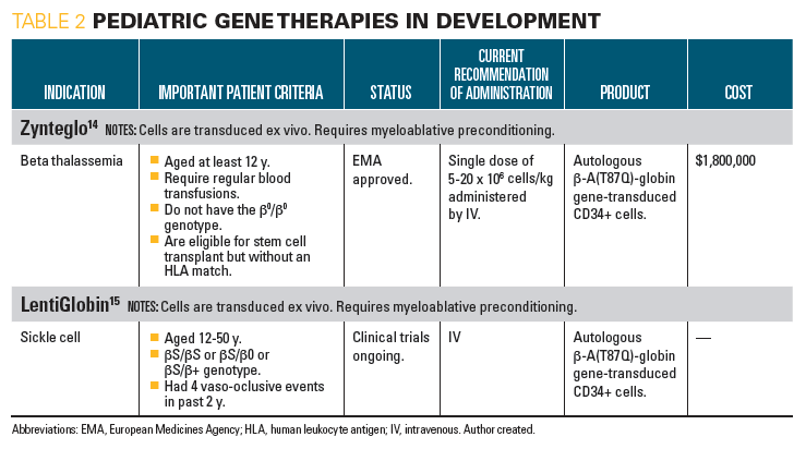 Currently, there are 3 FDA-approved gene therapies for pediatric patients (Table 1 and below), but more are in various stages of research and development (Table 2).