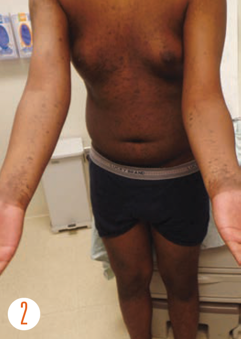 At follow-up 2 weeks later, the patient had mild improvement in pruritus and appearance of the rash. Fluocinonide 0.05% ointment twice daily was added for the most pruritic areas. At 8 weeks’ follow-up, pruritus had resolved and the rash had improved, with a few remaining foci of activity and residual PIH (Figure 2). Hydroxyzine and fluocinonide were stopped, and oral metronidazole 500 mg twice daily was added. A prior authorization for narrow band UV-B 3 times per month for 3 months was submitted.