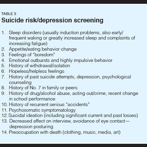 We suggest that every psychosocial interview seek to identify elements that correlate with anxiety or depression, the frequent precursors to adolescent suicide. Many of the items in the suicide screen (Table 3) have already been determined in the psychosocial history: severe family problems, changes in school performance, changes in friendship patterns, preoccupation with death in media or dress, sexual acting out, and drug, alcohol, and cigarette abuse.