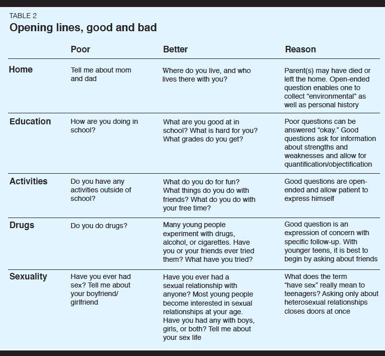 It is a mistake, for example, to say, “Tell me about your mom and dad.” This question assumes that the patient lives with both a mother and father. You may not know that a parent died recently or that a divorce is in the works. Start by asking, “Where do you live?” or, “Tell me about your living situation.” This can be followed by, “Who lives with you?” These questions allow the adolescent to describe exactly what is important to him at home. Then go on to find out what relationships are like at home and whether there has been a recent change-moving, running away, being institutionalized, or having someone join or leave the household. These events are extremely stressful to teens, who need a stable environment to accomplish the tasks of separating from parents, connecting with peers, and developing a positive self-image.
