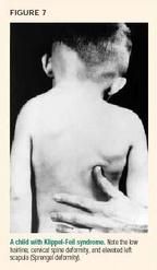 These vertebral defectshemivertebra, bar, and blockusually occur during the first six weeks of gestation; they therefore coincide with organogenesis, which explains their common association with other conditions. Any left thoracic curve should therefore prompt a more thorough evaluation, including MRI and renal ultrasonography, to look for congenital vertebral anomalies or defects in other organ systems. Patients with congenital curves include those who have Klippel-Feil syndrome5,12 (Figure 7), Goldenhar syndrome5 (Figure 8), or Jarcho-Levin syndrome5 (Figure 9).