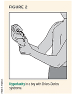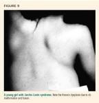 Evaluate tall, thin patients for a high-arched palate, lens dislocation, and abnormally long metacarpalssuggestive of Marfan syndrome. These patients will have an idiopathic scoliosis pattern of long sweeping right thoracic and left lumbar curves. Joint laxity, dislocating patellae and shoulders, and sternal deformities can be seen in the various types of Ehlers-Danlos syndrome (Figure 2).