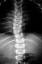 Congenital scoliosis may result from a range of anomalies in the developing vertebrae and most commonly presents as a left thoracic curve. The radiograph below shows a small left thoracolumbar curve due to a hemivertebra in a child with congenital scoliosis. A hemivertebra results from failure to form a complete vertebra, as opposed to a bar, which is failure of segmentation to form disk spaces between vertebrae. Two bars across the same vertebral segment form a block vertebrae with no potential for deformity. The greatest potential for deformity occurs when there is a hemivertebra on one side of the spine across from a bar.