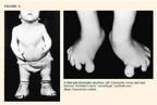 Osteochondrodystrophies are relatively rare conditions often characterized by short stature. Spinal deformity may manifest in this group, which includes achondroplasia, diastrophic dysplasia, pseudoachondroplasia, spondyloepiphyseal dysplasia, Larsen syndrome, and some mucopolysaccharidoses. Diastrophic dwarfs (Figure 3) may develop severe scoliosis as well as thoracic and cervical kyphosis and are at risk for quadriplegia.17 Larsen syndrome is characterized by multiple congenital dislocations of large joints, a flat face, and ligamentous laxity with frequent congenital defects of the cervical, thoracic, and lumbar spine.5