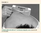 View the patient's back from the head, sides, and rear of the patient. A visible hump (Figure 1) is produced by convexity of the ribs and suggests spinal deformity with vertebral rotation. You can use an inclinometer (Scoliometer, Orthopaedic Systems, Inc.) to measure the rotational deformity (rib hump) of the spine and to approximate the lateral curvature (scoliosis) (Figure 4). Place the inclinometer on the peak of the hump and note the angle of trunk rotation. A rotation of 5° to 7° on an inclinometer corresponds to a 10° to 20° lateral spine curvature and should be evaluated radiographically. A rotation of less than 5° on inclinometer in a skeletally immature child is at risk of progression and should be followed. The smaller the curve, the longer the follow-up interval. Patients who may need bracing if further progression occurs should be followed within four months.