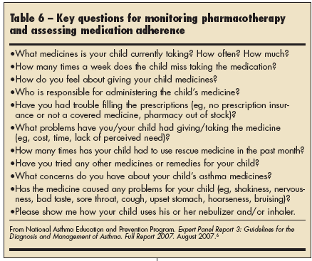 The child's quality of life and satisfaction with treatment should also be reviewed. HCPs should also be aware of some of the external factors that can affect asthma control. A cross-sectional study of 362 children aged 5 to 12 years with asthma who had experienced an acute exacerbation in the past year assessed demographic, family, and pediatric practice characteristics as predictors of asthma control.45 Factors associated with poor asthma control were Medicaid insurance, full-time or part-time maternal employment, and the presence of another family member in the home with asthma. The authors suggested that economic factors and a caregiver's job responsibilities may interfere with the caregiver's knowledge of the child's adherence to medication and level of asthma control. Although extrapolation to preschool- aged children cannot be made directly, the study suggests that the social history may affect asthma control.