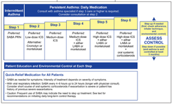 Failure of over-the-counter medications to relieve a child's recurring respiratory symptoms is often the impetus for a visit to the pediatrician's office.7 Before initiating therapy, it is important for the HCP to determine what medications the child is currently taking and to establish the step of therapy the child is on, based on the 6-step treatment chart of the guidelines (Figure 3). It is also important to assess the need for these medications and whether continued treatment would be beneficial. The child already may be using an inhaled SABA as needed for quick relief of symptoms.6 The HCP should determine the frequency of inhaled SABA use to assess the need to step up therapy.