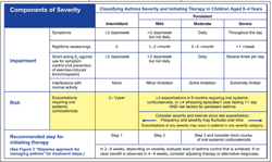 Once a diagnosis is made, additional information should be gathered to classify asthma severity, which is the intrinsic intensity of the disease.6 The initial classification of asthma severity is made before the child is taking long-term control medication. Severity classification is based on the domains of impairment and risk (Figure 2). Children are classified as having intermittent, mild persistent, moderate persistent, or severe persistent asthma on the basis of the assessments of both domains.