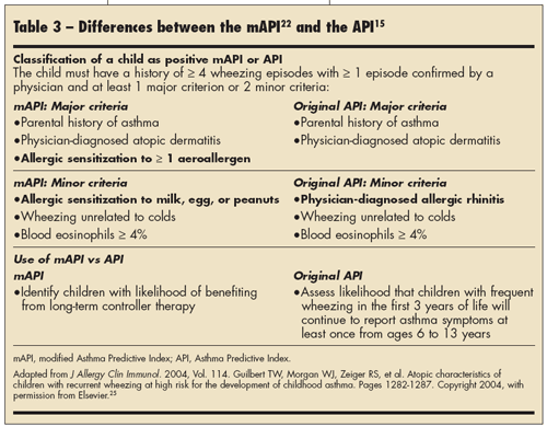 The original API was modified because allergic rhinitis is difficult to diagnose in young children and previously conducted studies have shown that early allergic sensitization to milk or eggs are predictors for developing persistent asthma. 22-24 Differences between the mAPI and the original API are described in Table 3.25 A positive mAPI requires the child to have at least 1 of 3 major risk factors or 2 of 3 minor risk factors. The PEAK study showed that children with the phenotype of a positive mAPI who received fluticasone propionate 88 µg twice daily had a significantly greater proportion of episode-free days (P = .006) and reduction in exacerbations requiring systemic corticosteroids (P < .001) compared with children who received placebo over the 2-year treatment period.26 The children were followed for 1 year after treatment was discontinued. Findings from the treatment-free year did not support a disease-altering effect after ICS discontinuation.
