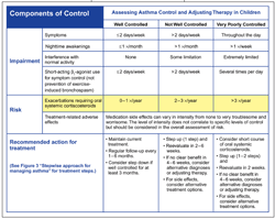 Similar to asthma severity, asthma control is defined in terms of reducing impairment and risk (Figure 4).6 In contrast to severity, asthma control reflects the degree to which asthma risks, symptoms, and limitations are minimized and goals of therapy are met. Asthma control becomes the emphasis for clinical management once therapy is initiated. Decisions to maintain or adjust therapy are based on the child's level of asthma control.