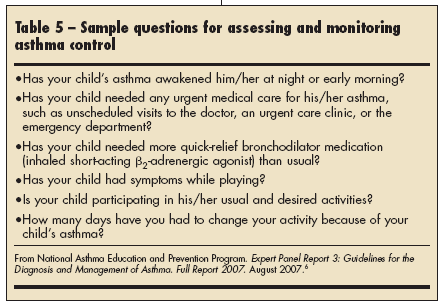 The guidelines recommend periodic assessment and monitoring of asthma control at 1- to 6-month intervals. 6 The frequency of HCP visits depends on the patient's level of asthma control and is based mainly on clinical judgment. As previously discussed, for children receiving a therapeutic trial of asthma medication, control should be assessed within 4 to 6 weeks of therapy initiation. Generally, children with intermittent or mild persistent asthma that has been controlled for 3 months or more should see their HCP every 6 months. Children with uncontrolled asthma, severe persistent asthma, or difficulty in following a treatment plan should see a physician more frequently. If step-down therapy is anticipated, the guidelines recommend a 3-month follow-up interval. The primary methods of monitoring asthma control in children are self-assessments filled out by a parent or family member and evaluation by the HCP.