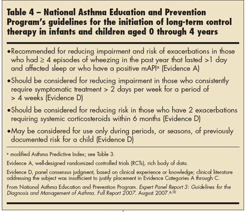 Nevertheless, the outcome of the PEAK trial led to the guideline recommendation that a long-term daily controller (ICS) be initiated for reducing risk and impairment in children younger than 5 years who have had 4 or more episodes of wheezing in the past year that lasted more than 1 day and affected sleep and who have risk factors for developing persistent asthma based on the mAPI.6,26 Many children have intermittent episodes of viral-induced wheezing, and the PEAK trial helps define which of those children with recurrent episodes will benefit from maintenance therapy. A daily long-term controller also should be considered for children with impairment (eg, persistent symptoms) or risk as outlined in Table 4.
