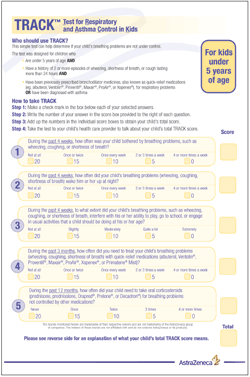 The TRACK tool includes 4 impairment questions: 3 about the frequency of respiratory symptoms, activity limitations, and nighttime awakenings in the past 4 weeks, and 1 about rescue medication use in the past 3 months.7 It also includes 1 riskrelated question about OCS use in the previous year. Each question is scored from 0 to 20 points, for a total score between 0 and 100 points. Higher scores indicate better respiratory control. A TRACK score lower than 80 suggests uncontrolled asthma and may be an indication that HCPs need to provide further evaluation and possibly adjust treatment plans. A TRACK score of 80 or more suggests that the child's breathing problems are controlled.
