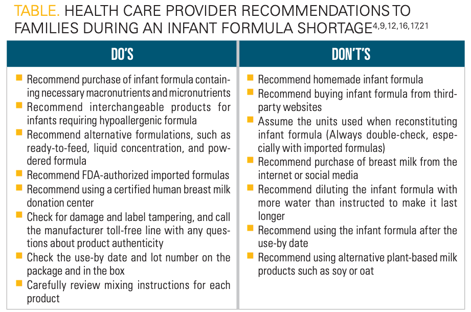 HCPs should be prepared to discourage conservation practices that could lead to unintentional infant harm. For example, in an effort to make infant formulas last longer, caregivers may dilute the product with more water. Infant formula should never be overdiluted, as it will offset the nutritional concentration and cause electrolyte disturbances.6,12,21 These complications can be fatal. In addition, homemade formulas should be discouraged, as they do not meet the nutritional or safety standards that commercial products have.21 Online recipes for homemade formulas may contain inadequate or excess amounts of vitamins and minerals and have been linked to severe, life-threatening complications.12 A case series published by the AAP described 2 patients who were fed with organic homemade infant formulas after transitioning from exclusive breastfeeding by the age of 1 month.22 The most notable laboratory abnormalities were related to inadequate vitamin D supplementation. Low levels of vitamin D resulted in inadequate calcium and phosphorus absorption and subsequent breakdown of bone. Further complications experienced by the patients included bone demineralization, cardiac arrest, hepatotoxicity, and ischemia of multiple organs. A summary of the do’s and don’ts for HCP recommendations during an infant formula shortage can be found in the Table.4,9,12,16,17,21