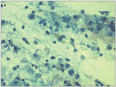 Bronchoalveolar lavage performed the next day showed diffuse blood in the tracheobronchial tree and numerous hemosiderin-laden macrophages (B). Results of testing for glomerular basement membrane (GBM) antibody were normal. A test for c-antineutrophil cytoplasmic antibodies (c-ANCA) was positive; however, the lack of other clinical signs/symptoms suggested that this may have been a nonspecific marker for an autoimmune process; the lung biopsy confirmed the result. The patient received a blood transfusion and remained stable during her 4-day hospital stay. At discharge, her respiratory symptoms had resolved and her hemoglobin level had normalized.
