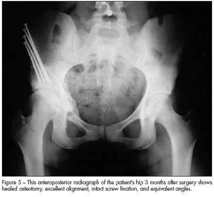 The patient underwent periacetabular osteotomy. She healed uneventfully; Figure 5, an AP radiograph of her pelvis 3 months after surgery, shows the healed osteotomy. At this point, she had very little pain. Her mobility continues to improve, and her risk for early degenerative arthritis is significantly reduced.