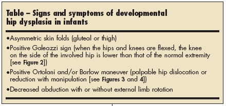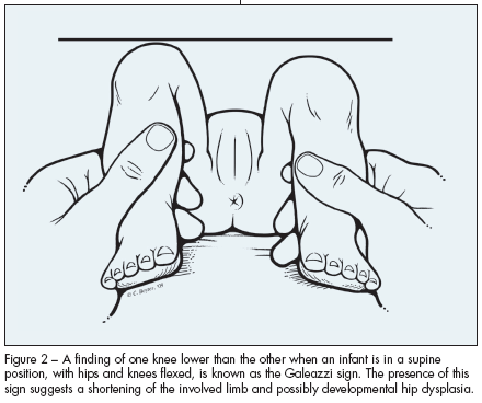 Often DDH can be picked up in a neonate with a routine history taking and physical examination. Signs and symptoms that suggest the diagnosis (Table) include asymmetric skin folds; the presence of a condition known to be associated with DDH, such as torticollis or clubfoot; and one knee lower than the other when the infant is in a supine position with hips and knees flexed (Galeazzi sign [Figure 2]).
