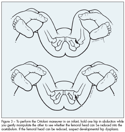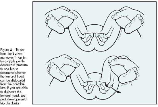 Two maneuvers are also commonly used to detect DDH in infants. In the Ortolani maneuver, one hip is held in abduction while the other is gently manipulated to see whether the femoral head can be reduced into the acetabulum (Figure 3). In the Barlow maneuver, gentle downward pressure is applied to one hip to determine whether the femoral head can be dislocated from the acetabulum (Figure 4).1