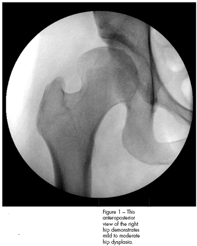 Radiographs were obtained. A standing anteroposterior (AP) view of the pelvis and bilateral false profile (25 degrees oblique) views of the hips revealed a dysplastic hip on the right side with mild coxa magna (slightly large femoral head compared with the left side) (Figure 1). The lateral center edge angle of the right hip was neutral, and the anterior center edge measured −5 degrees. Anterior and lateral coverage of the left hip, by contrast, was more than 25 degrees (which is the norm). There was minimal subluxation, and congruency between the femoral head and the acetabulum was maintained on radiography.