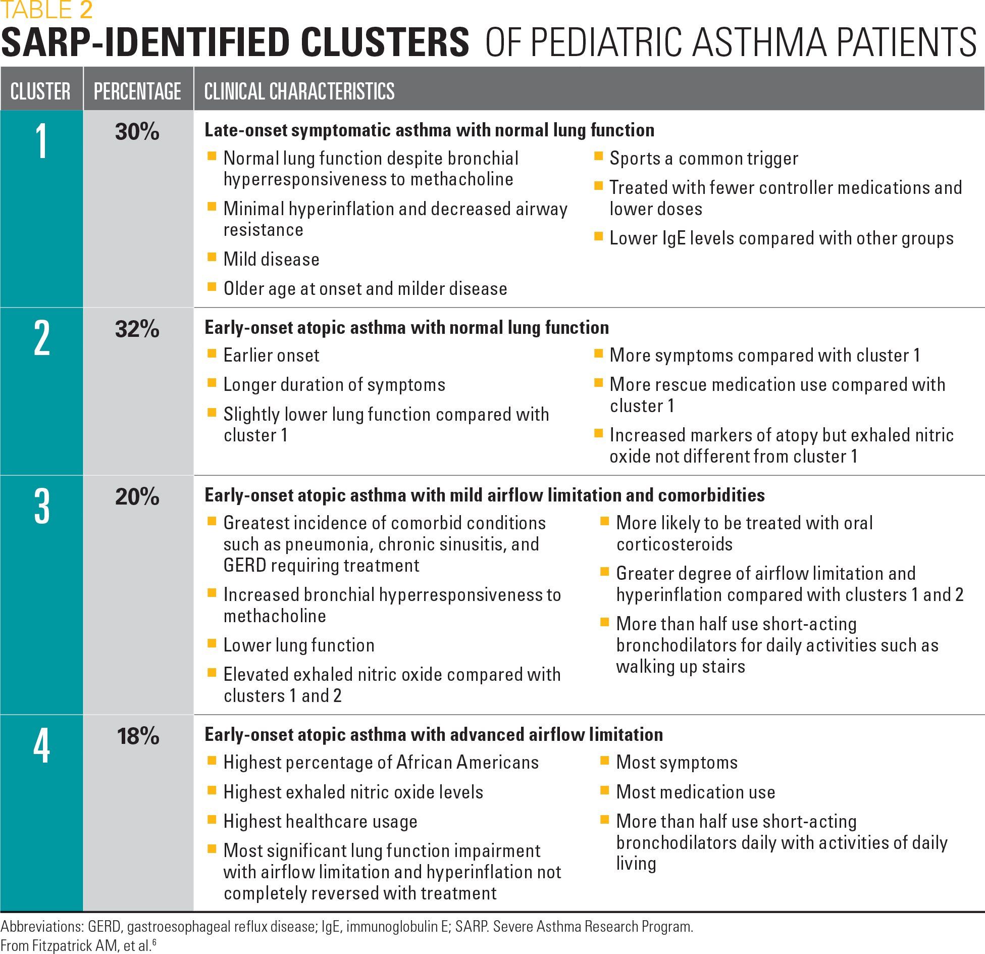 Through characterization procedures that include questionnaires, spirometry, skin testing, blood testing such as IgE levels, and methacholine testing, SARP identified 3 variables (asthma duration, the number of asthma controller medications, and baseline forced expiratory volume (FEV) 1 percent predicted values) that were able to cluster pediatric asthma patients into 4 groups. See Table 2 for these classifications. Further emphasizing the heterogeneity of asthma, severe asthma was identified in all 4 clusters. Identifying such “phenotypes” allows for the potential of tailoring treatment strategies toward the unique characteristics of that group’s pathophysiology. Of concern to the pediatrician, these phenotypes cross definitions of asthma severity in the current asthma guidelines.6