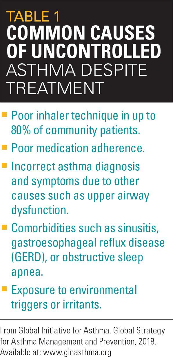 Asthma is a complicated chronic illness and management is impacted by many domains. Whereas most asthmatic children can achieve good symptom control by avoiding triggers and regularly using controller medications, some will not achieve optimal results even with maximal therapy.4 One of the goals of the pediatrician is to identify whether a patient on maximal therapy has asthma refractory to treatment or whether symptoms are due to noncompliance, psychosocial factors, persistent environmental triggers, or comorbidities. Table 1 gives the pediatrician areas to examine to identify poorly controlled or undertreated asthma.