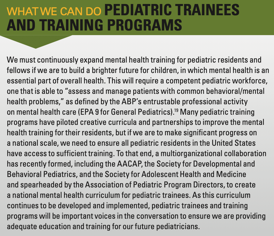 To mitigate the level of need that has created the current crisis, it is particularly important that emerging mental health symptoms be recognized and addressed early within the pediatric medical home before they escalate to the level of crisis. Historically, however, mental health care has not been a substantial part of pediatric residency training, leaving many pediatricians feeling unprepared to care for the mental health needs of their patients. Many resources now exist, and more are being developed every year, to help pediatricians gain the knowledge and skills to care for patients’ mental health needs.