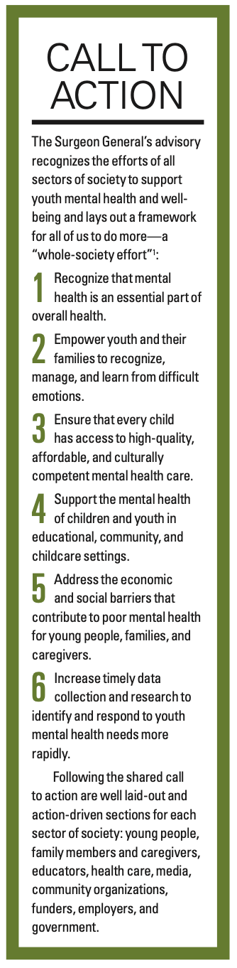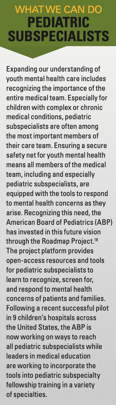 How did we get here, and what roles can we play in the pediatric community to enhance our capacity to identify and address mental health in youth and advocate for effective, sustainable models of care? How can we as pediatricians step up to Murthy’s call to engage with all the “institutions that surround young people and shape their day-to-day lives—schools, community organizations, health care systems, technology companies, media, funders and foundations, employers, and government?”2
