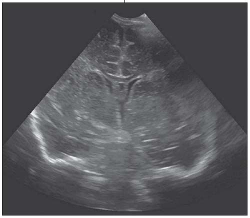 Figure 2 – An ultrasonogram obtained 7 days later demonstrates resolution of the hydrocephalus and reabsorption of the linear intraventricular strands.
