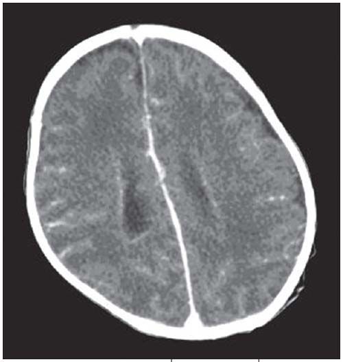 On day 2 of hospitalization, a cranial ultrasonogram revealed hydrocephalus, with echogenic ependyma of the lateral ventricles, related to ventriculitis (Figure 1). Linear synechiae noted within the ventricles were characteristic of inflammation. The 3rd and 4th ventricles were normal. The findings represented a noncommunicating hydrocephalus at the level of the Monro foramen. A week later, a follow-up ultrasonogram showed resolution of the hydrocephalus and reabsorption of the intraventricular echogenic strands (Figure 2); there was no evidence of a focal brain lesion. A contrast-enhanced CT scan on day 17 revealed enhancement of the ependymal lining of the lateral ventricles with no hydrocephalus (Figure 3). Slight cisternal enlargement at the left lateral cerebral convexity and right frontal region, consistent with sympathetic effusion (exudative effusion caused by disease in nearby structure), was also present. The parenchyma was normal.