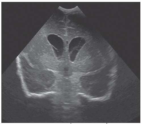 Figure 1 – Coronal cranial ultrasonogram shows hydrocephalus. Echogenic ependymal lining of the lateral ventricles represents ventriculitis. Linear echogenic strands within the ventricles are consistent with synechiae.