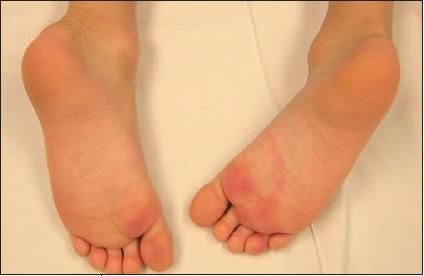 For 3 days, a 6-year-old boy had nonpruritic, painful lesions on the soles of both feet. His mother reported that he had difficulty in sleeping and walking but had no fever or other systemic symptoms.