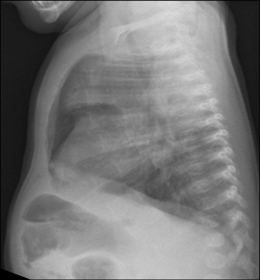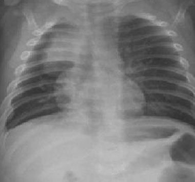 Laboratory tests and radiographic evaluation. Initial laboratory results indicated a slightly low ionized calcium level and an elevated alkaline phosphatase level. Chest radiographs showed right upper lobe consolidation (Figure 2). Pulmonology, ophthalmology, genetics, endocrinology, and gastroenterology specialists were consulted.