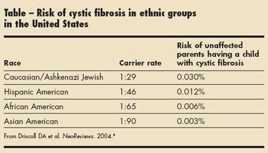 Cystic fibrosis (CF) is a genetic disease inherited in an autosomal recessive pattern. The implicated mutations are located on the long arm of chromosome 7, in the gene that encodes the CF transmembrane conductance regulator (CFTR); this protein contains 1480 amino acids and functions as a chloride and bicarbonate ion transporter across cell membranes. 1-3 More than 1600 CF mutations have been identified. The risk of inheriting one of these mutations is related to a patient’s race and ethnicity. US persons of Caucasian or Ashkenazi Jewish descent have a 1 in 29 chance of carrying a CF mutation; therefore, the risk of unaffected Caucasian and Ashkenazi Jewish parents having a child with CF is 0.030%.4 The risk is diminished in other ethnic groups (Table).
