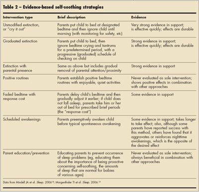 3There are many methods for training a child to self-soothe. The approach to teaching self-soothing that has been attributed to Ferber12-also known as the extinction or “cry it out” method-can be highly effective, works quickly, and seems to have more “staying power” than other approaches. There is no hard evidence that this approach has detrimental effects, either short or long term. Other approaches to enabling self-soothing may be less stressful for the parents, but these tend to take longer to take effect. Also, in my experience, infants with whom other approaches are used are more vulnerable to backsliding with changes in caregiver or sleeping environment (eg, as a result of travel), and families may find that they need to revisit the training process. For tips on when to initiate the extinction approach, see the answer to question 2, above.