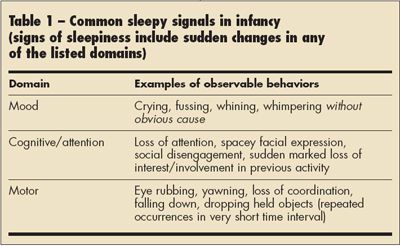 Learning to identify “sleepy signals.” To ensure that their baby gets the naps he needs, encourage parents to look for signs of sleepiness in their child and then respond to these expeditiously (Box). See Table 1 for a list of common sleepy signals in infancy. Unless parents are watching for these signs, it is very easy for them to overlook the baby’s sleep need, and as a result, for their child’s brain to miss out on a “feeding.”