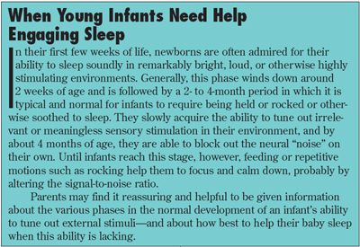 5Parents may want to attribute the awakenings to teething or other developmental milestones, but there is little evidence for this. Make parents aware that although the achievement of sleeping through the night is welcome, it is never permanent. Developmental milestones, such as crawling or standing, cause ripples in a child’s sleep habits. In addition, the 90-minute alertness rhythm undergoes changes in toddlerhood. However, if an infant has been taught to self-soothe, and if the parents promote healthy sleep habits and understand their baby’s sleepy signals, they should be able to adapt to these changes. Often-although not always-once an infant has learned to fall asleep on his own, this skill generalizes fairly quickly to middle-of-the-night awakenings. Note that feeding, rocking, or bringing the infant into the parents’ bed reinforces full-fledged awakenings.