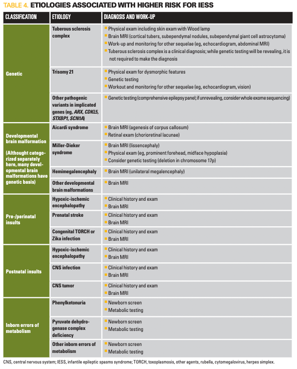 A detailed clinical history and physical exam should be conducted in all patients. MRI is strongly recommended if not previously obtained, even in cases where etiology appears evident (eg, a child with trisomy 21). This initial workup will identify an underlying etiology in over 50% of presenting infants.10,11 Genetic testing followed by potential metabolic testing will be informative in most of the remaining cases.11 Despite thorough diagnostic evaluation, in a sizable minority of cases a clear etiology will not be identified; with a growing list of genes implicated in IESS, it is likely that many of these are genetic in origin.12