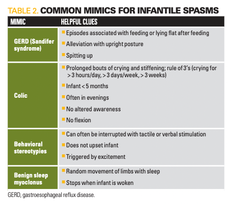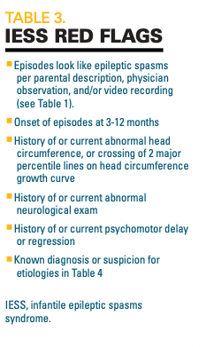 The differential diagnosis for IESS is broad and includes both neurologic and non-neurologic considerations. Table 2 provides some common mimics for spasms with clinical clues. Given the possible consequences of untreated IESS and evidence for frequent misdiagnosis, it is important to maintain high clinical suspicion, especially in the setting of suspicious features.5,7 Red flag features are highlighted in Table 3.
