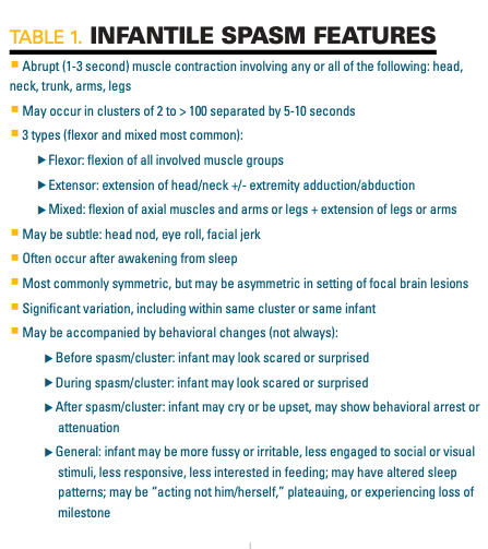 An infantile spasm is brief and abrupt, generally 1 to 3 seconds, with muscle contraction that can include the head, neck, trunk, and/or extremities. Spasms can occur in clusters, repeating every 5 to 10 seconds over minutes but, especially early in the disease course, may be isolated and infrequent. They may also be subtle, ranging from a brief head nod or facial/eye movement to a jackknifing of the torso at the waist with contraction of the trunk and extremities. When clustering, they often follow a crescendo-decrescendo pattern of intensity in a series of 2 to 100 spasms. See Table 1 for a summary of spasm features.