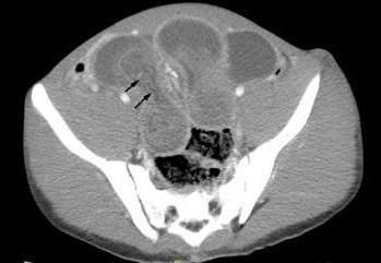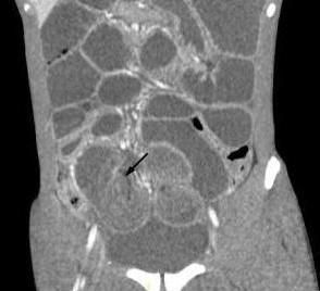 A CT scan of the abdominopelvic region was obtained to rule out bowel obstruction. An axial CT image showed significant distention of the distal ileal loops with concentric alternating rings of high and low attenuation and swirling of the mesenteric fat and mesenteric vessels (Figure 1, above). Figure 2 (left) shows the intussusceptum (arrows), with an accompanying complex of mesenteric fat and blood vessels, surrounded by the thick-walled intussuscipiens. Surgery was performed to prevent vascular compromise and bowel necrosis. Operative findings revealed ileal intussusception and intestinal necrosis secondary to an invaginated Meckel’s diverticulum. Postopertaively, the patient did well without any complications.