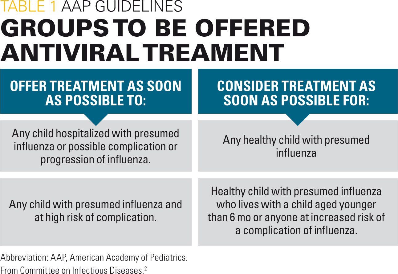 If the influenza test is negative, the pediatrician cannot rule out an influenza infection, especially if the pediatrician is utilizing RIDT or another test with low sensitivity. Similarly, if the patient is presenting 4 or more days after symptom onset, the negative test could be a false negative. The pediatrician should use clinical signs and symptoms along with local influenza activity to decide if antiviral treatment is indicated. If the patient is being admitted to the hospital, it is advisable to begin therapy without waiting for testing results if the pediatrician suspects influenza. Similarly, the high-risk patient or any patient with progressive disease also is a candidate for empiric treatment.15