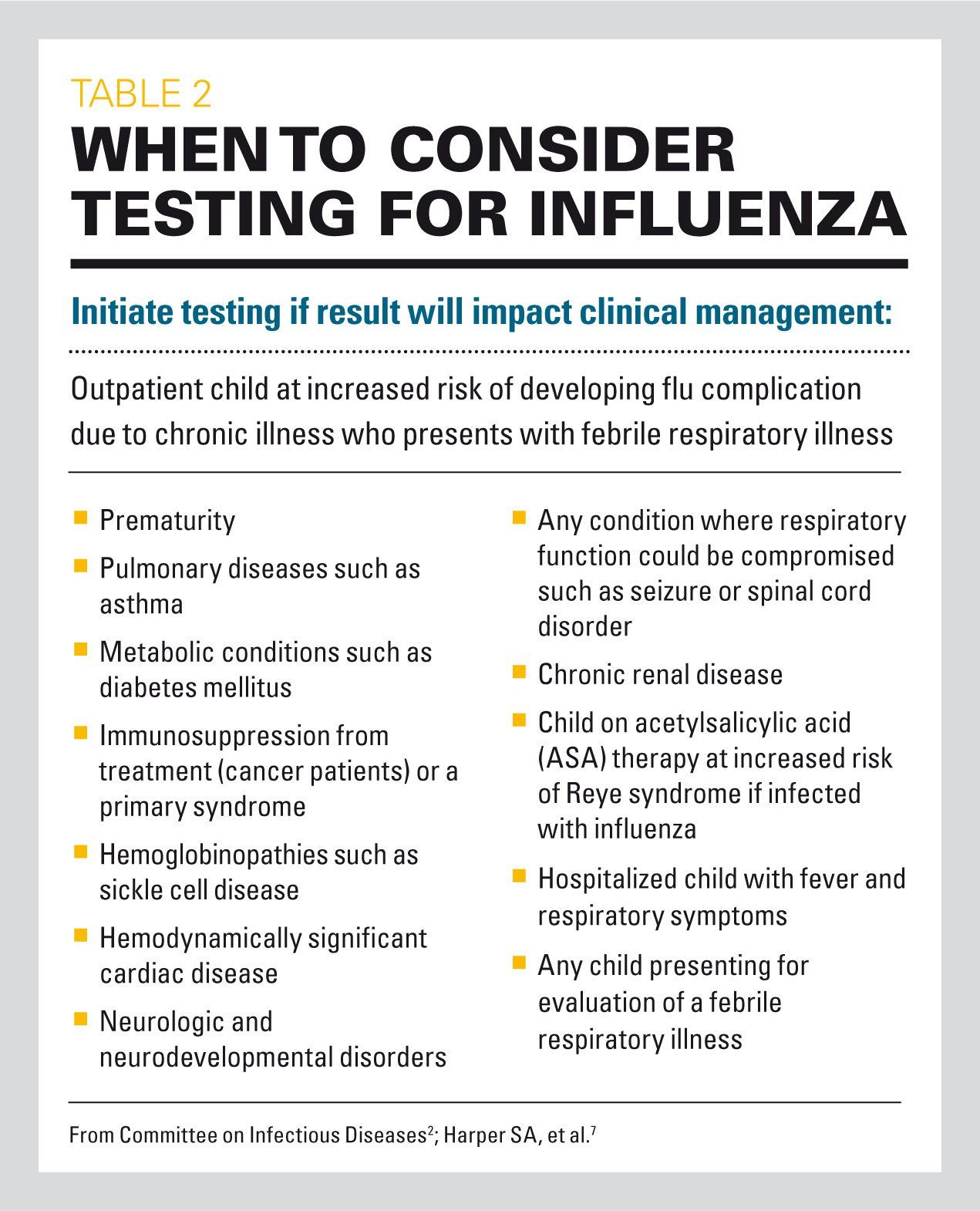 Laboratory testing for influenza virus should be undertaken when a child has flu symptoms and the results will impact management of the patient, including those at high risk.2,7 See Table 2 for children to consider for testing. The CDC recommendations for testing are depicted in the Figure.8