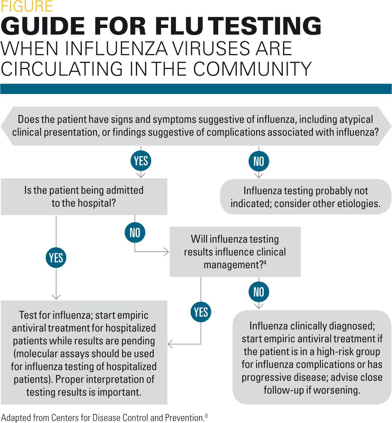 8. Centers for Disease Control and Prevention. Influenza (Flu). Guide for considering influenza testing when influenza viruses are circulating in the community. Available at: https://www.cdc.gov/flu/professionals/diagnosis/consider-influenza-testing.htm. Updated November 2, 2016. Accessed February 5, 2018.