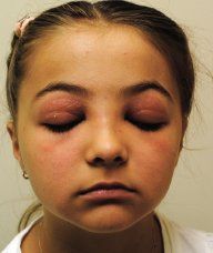 This 8-year-old girl has had swollen, red eyelids for the past 24 hours. She denies pain or pruritus. She has had no eye drainage, fever, or other systemic signs of illness. She reports some mild fatigue for the past few months but denies myalgias or decreased muscle strength.