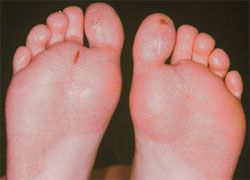 Figure – The scaling and fissures on the soles of this 10-year-old boy’s feet are the result of juvenile plantar dermatosis. Measures to help prevent rapid water loss from feet that have become sweaty in occlusive footwear often prove helpful.