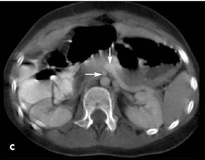 Axial CT images showed an appendicolith (A) and, 9 mm inferiorly, a tubular structure with intraluminal air and surrounding inflammatory changes in the left lower quadrant (B). These findings were consistent with appendicitis. Another view (C) showed that the superior mesenteric vein (SMV) (vertical arrow) joined with the splenic vein to form a portal confluence that rotated to the left of the superior mesenteric artery (SMA) (horizontal arrow). This finding was consistent with GI malrotation. The duodenal- jejunal junction was identified to the right of the vertebral column (not shown).