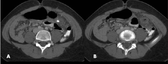CT findings of acute appendicitis can include an enlarged caliber (greater than 6 mm in maximal transverse dimension), pericecal and periappendiceal inflammatory changes, phlegmon, extraluminal gas, and an appendicolith. 2 Congenital intestinal malrotation on CT can be determined by transposition of the SMA and SMV, with the SMA on the right side of the SMV, near its origin from the aorta.3