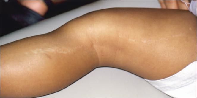 This self-limited unilateral dermatitis of unknown cause usually affects preschool children.1-3 Girls are 2 to 3 times more frequently affected than boys.4 The eruption consists of flat-topped pink or flesh-colored papules with a fine scale that form a linear band of less than 1.2 cm in width. It often follows the lines of Blaschko and may extend the entire length of an extremity.