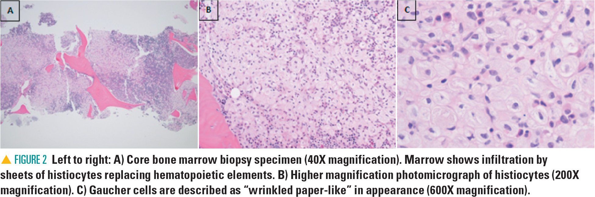 The bone marrow biopsy revealed Gaucher cells, macrophages filled with lipid material that accumulate in Gaucher disease (GD) and that are a primary feature. These cells have a characteristic histologic appearance (Figure 2). However, there are several conditions including hematologic malignancies in which Gaucher-like cells, or “pseudo-Gaucher,” cells have been noted, particularly in circumstances with high cell turnover.7,8 Glucosylceramide is a major component of cell membranes and macrophage glucocerebrosidase activity may become saturated in disorders associated with high cellular turnover. Pseudo-Gaucher cells are benign histiocytes with abundant cytoplasm resembling Gaucher cells on light microscopy.7 However, Gaucher cells have a distinct appearance on electron microscopy that helps to distinguish them from pseudo-Gaucher cells, and this has been suggested to express a different cytokine profile.8 Furthermore, with suspicion of GD based on the noted Gaucher cells, confirmatory testing should be completed to accurately diagnose a patient.
