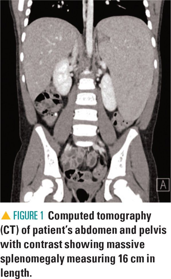 At this time, an abdominal ultrasound was performed to confirm that what was initially described as a right upper-quadrant mass was her enlarged spleen. Abdominal and pelvic computed tomography (CT) was also obtained at this time in the ED to better assess for mass effect of her organomegaly, further characterize the spleen, assess for abdominal lymphadenopathy, and confirm a normal-sized liver (Figure 1). At this time, clinicians presumed that her severe splenomegaly was causing a pseudo-obstructive effect resulting in emesis with oral intake.
